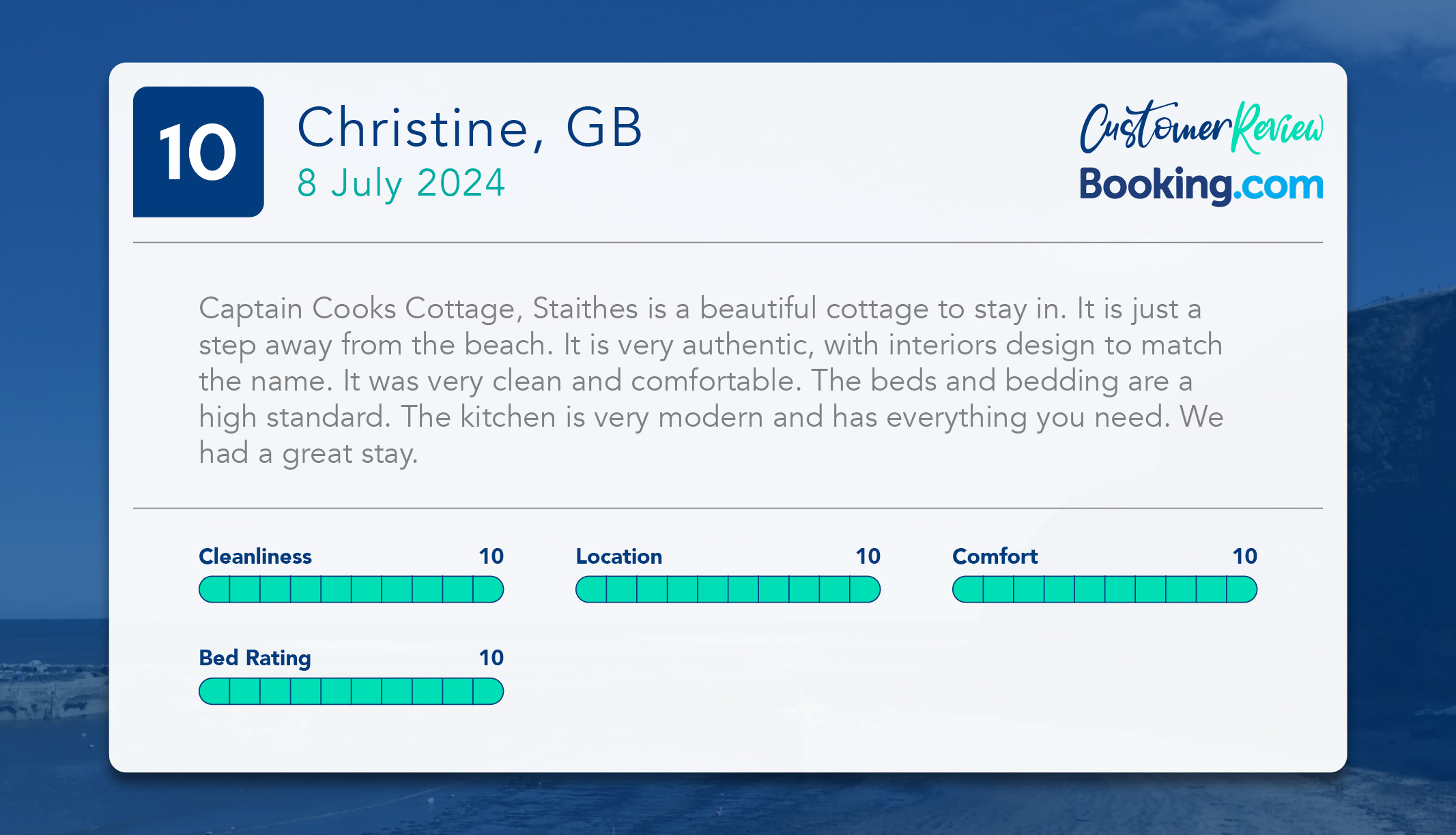 Captain Cook’s Cottage is located in the heart of Staithes, down in the harbour overlooking the sea, beach and surrounding breathtaking scenery. The cottage is fully equipped and sleeps 7 people (2 doubles and 1 triple). No pets and no smoking.